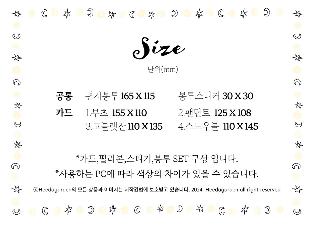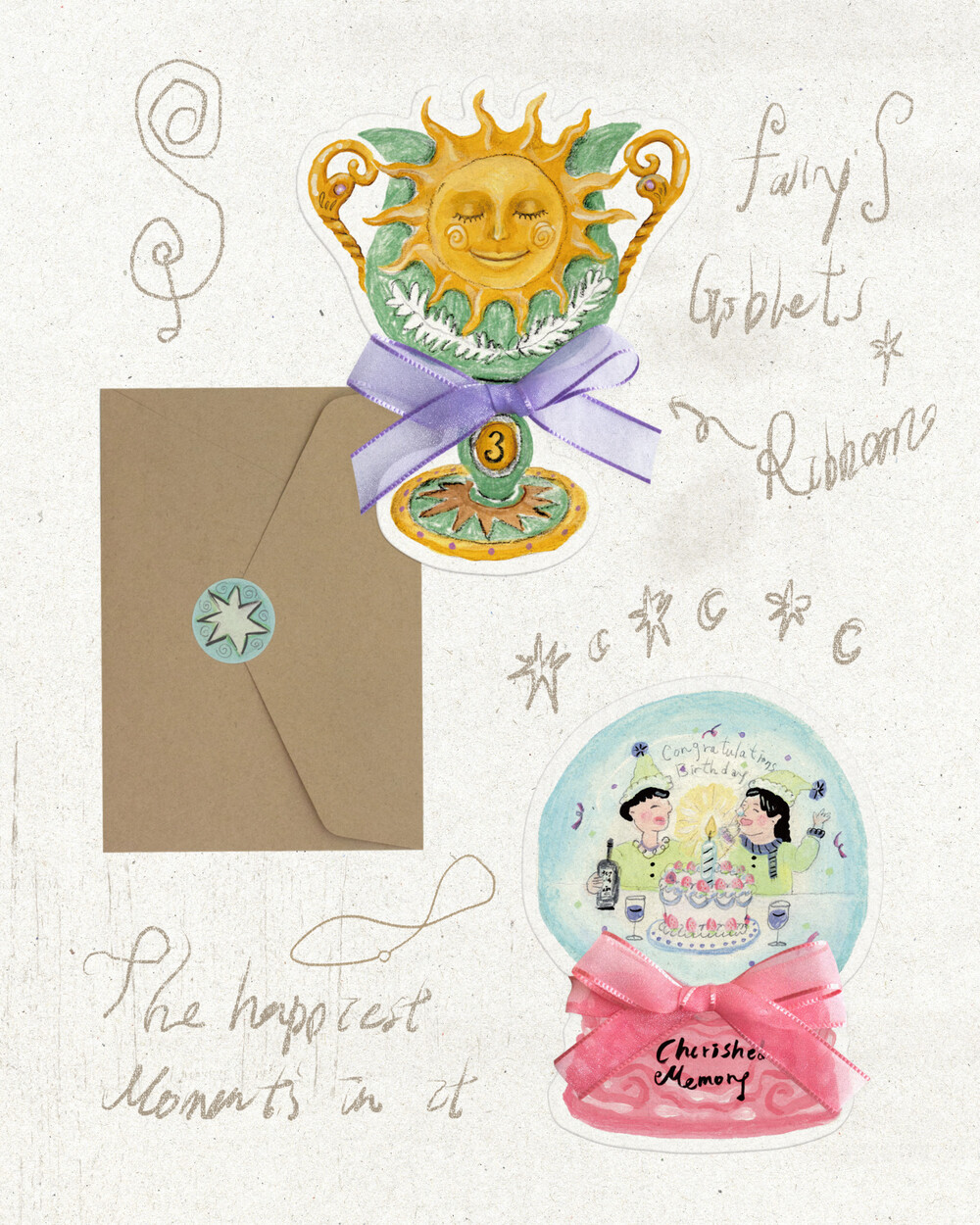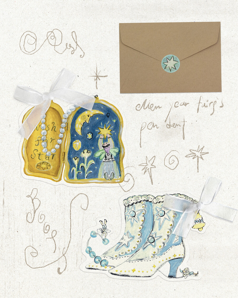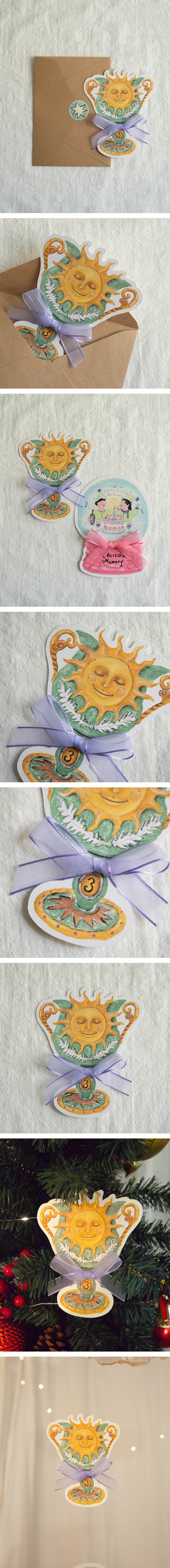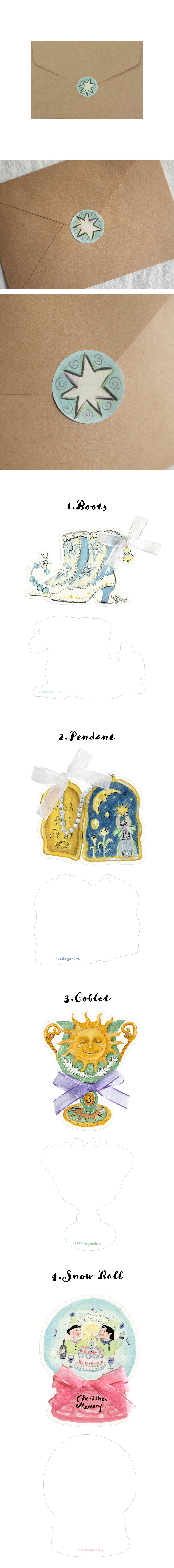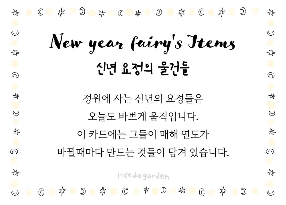 정원에 사는 신년의 요정들은 이맘때즈음 가장 바쁘게 움직입니다. 이 카드에는 그들이 매해 연도가 바뀔때마다 만드는 것들이 담겨 있습니다.