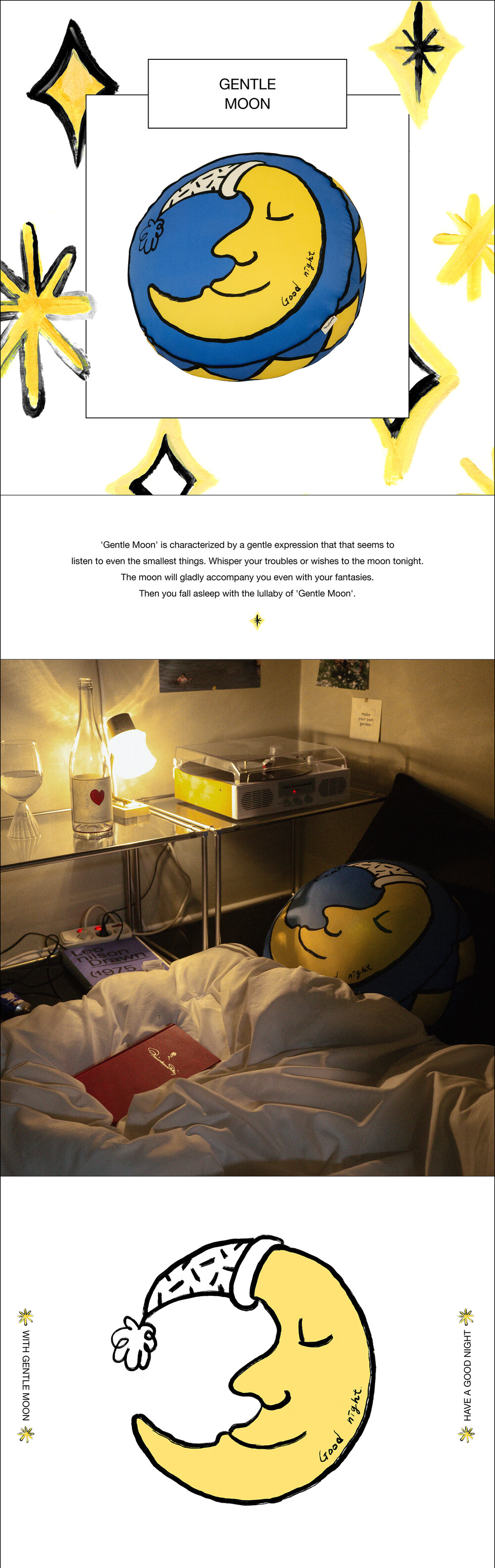 '젠틀 문'은 무엇이든 들어줄 듯한 온화한 표정이 특징이랍니다. 오늘 밤의 잠 못 이루는 고민이나 작은 소원을 그에게 털어놓아 보세요. 뜬 구름 잡는 공상도 흔쾌히 함께해줄거예요. 그러다 젠틀 문의 자장가로 어느새 스르르 잠에 빠져드는 거예요.